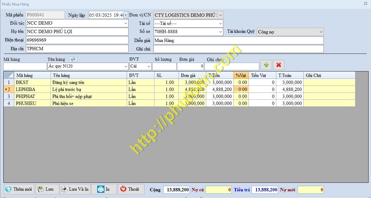 - Nhà cung cấp(Lấy hàng)/Đơn vị vận chuyển(Thuê/Xe ngoài) : Tên hàng, số lượng, đơn giá, VAT, thành tiền.